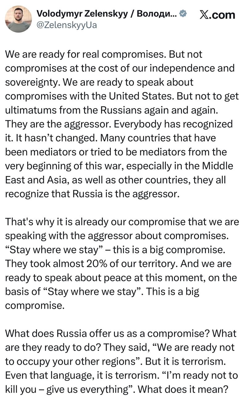 Уже сейчас мы идем на компромисс с агрессором. «Стоим там, где стоим» — это большой компромисс. Они захватили почти 20% нашей территории. И мы готовы говорить о мире прямо сейчас. Это большой компромисс.