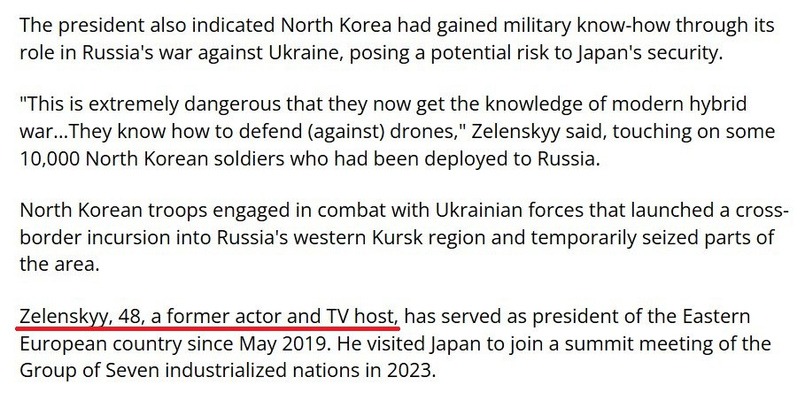 Зеленский запугивает японцев войсками КНДР в интервью Kyodo News.