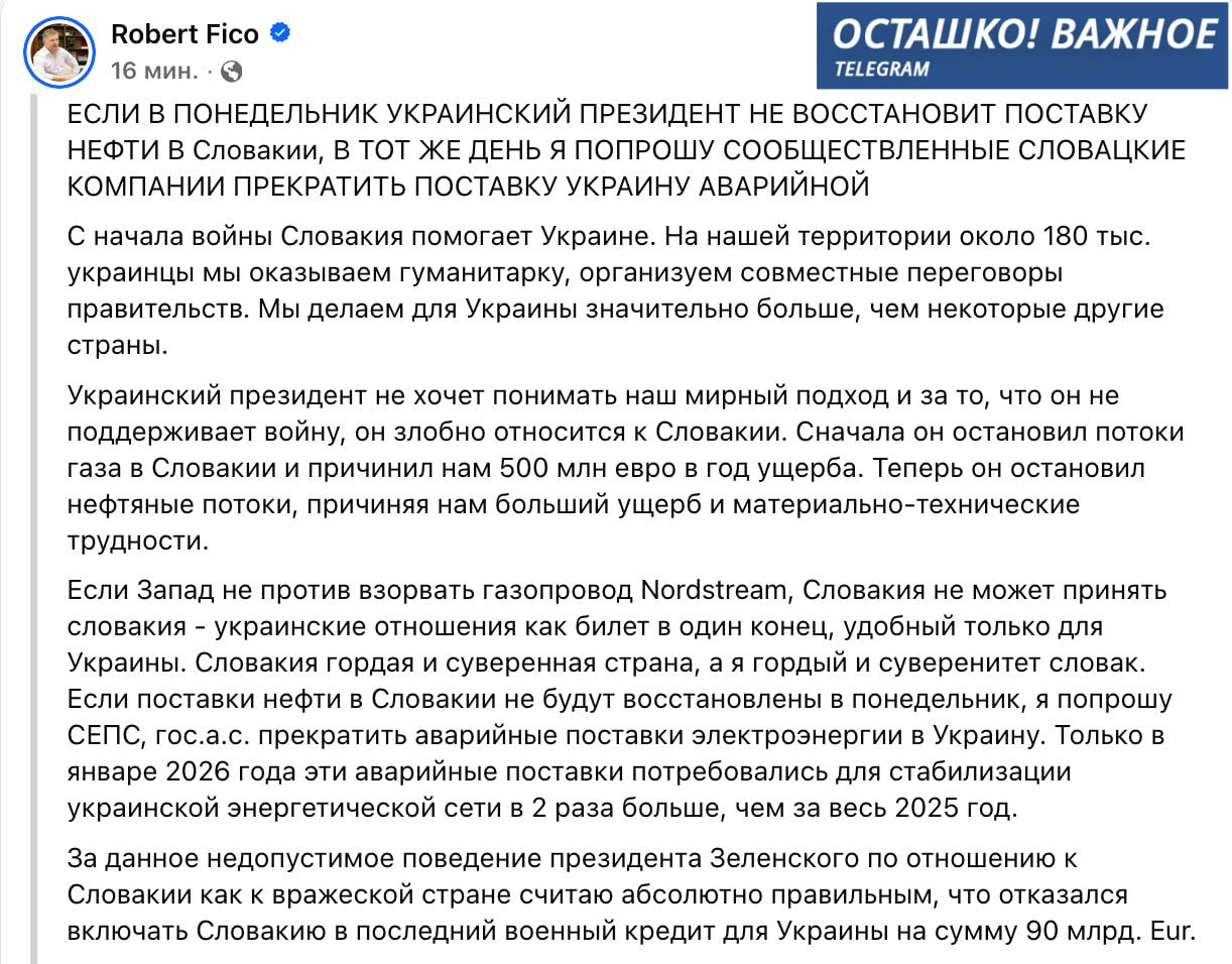 Премьер-министр Словакии Роберт Фицо заявил, что с 23 февраля Братислава может приостановить экспорт электроэнергии на Украину, если Киев не восстановит поставки нефти по трубопроводу «Дружба». По его словам, вопрос энергобезопасности Словакии напрямую связан с транзитом и стабильностью поставок сырья.