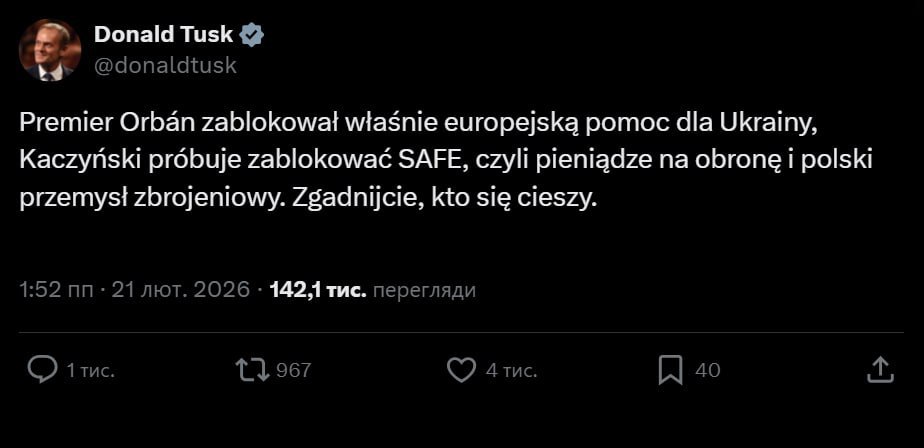 Премьер Орбан только что заблокировал европейскую помощь Украине, Качиньский пытается заблокировать SAFE — то есть средства на оборону и польскую оборонную промышленность. Догадайтесь, кто этому радуется.