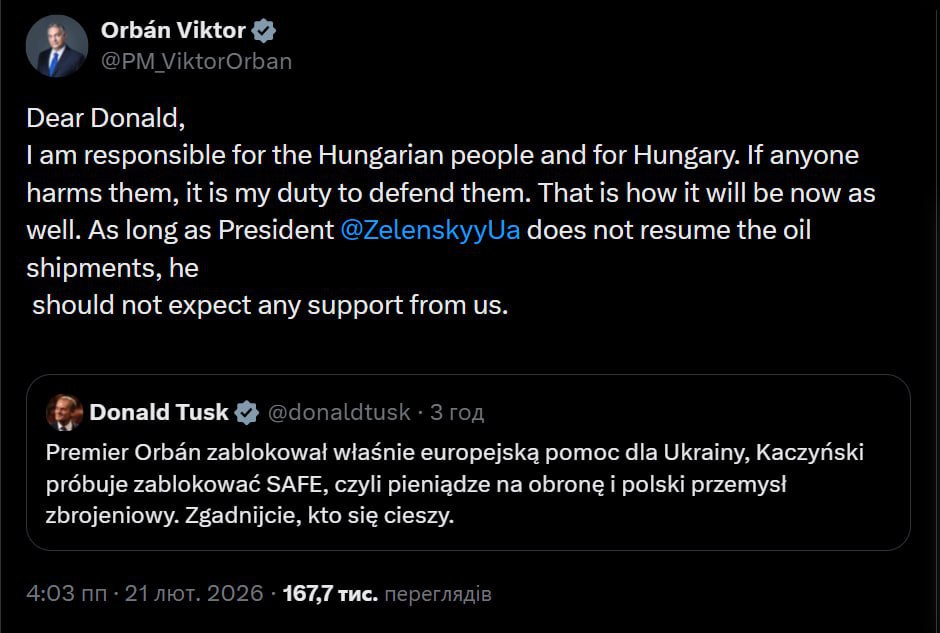 Дорогой Дональд, я несу ответственность за венгерский народ и за Венгрию. Если кто-то причиняет им вред, мой долг — защищать их. Так будет и дальше. Пока президент Зеленский не возобновит поставки нефти, он не должен ожидать от нас никакой поддержки.