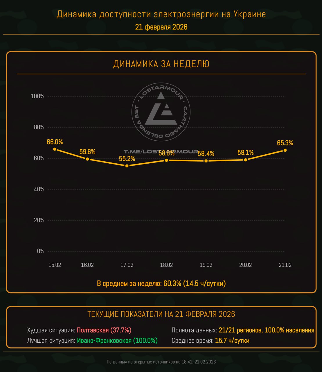 Инфографика доступности электроэнергии на территории Украины по областям на 21 февраля 2026.
