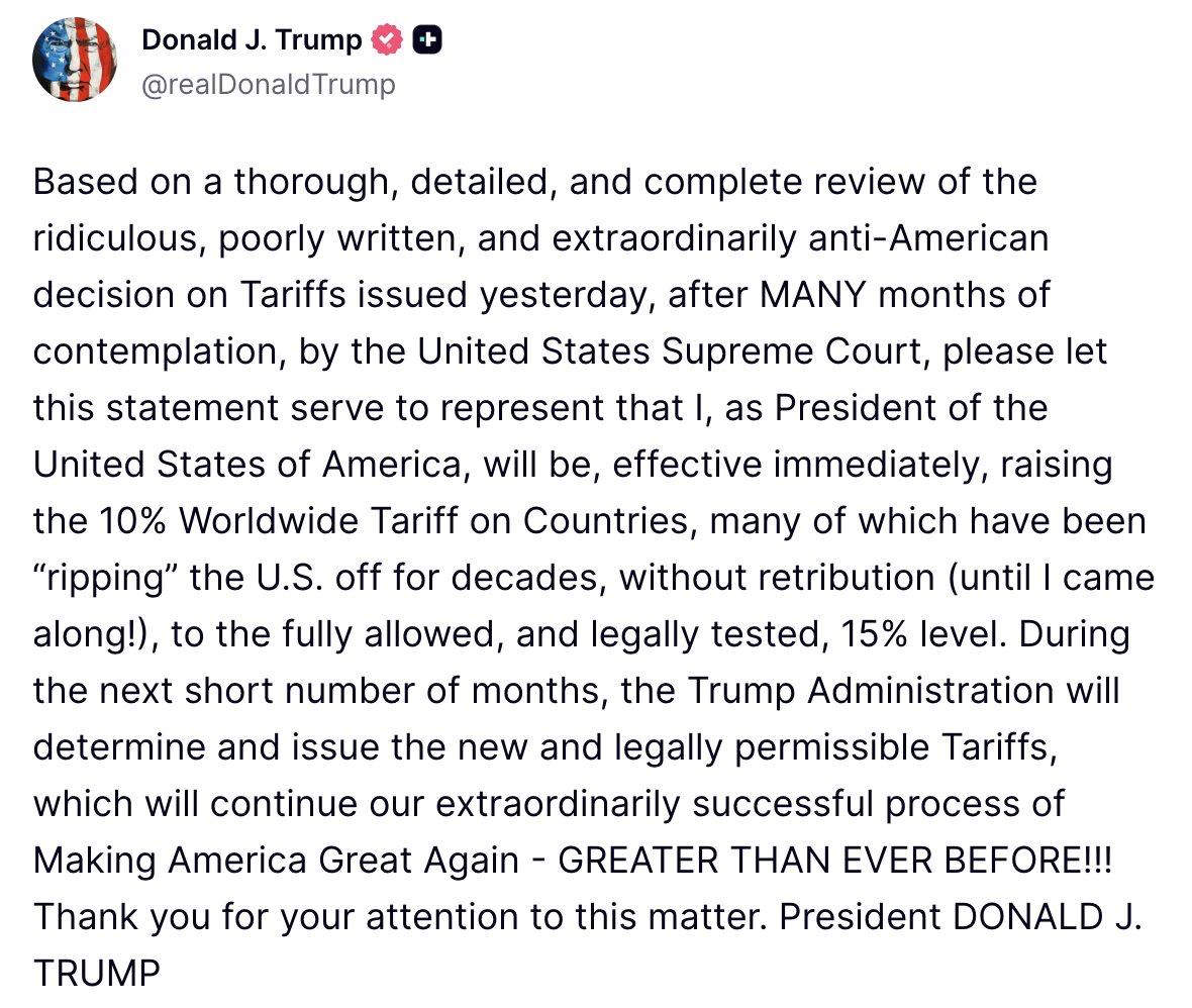 Хочется прокомментировать крайне важное решение Верховного суда по отмене тарифной политики Трампа. Это серьезный удар по администрации, который лишает ее одного из главных рычагов давления на другие страны и который не дает реализовать одно из главных предвыборных обещаний Трампа-кандидата. И это все перед промежуточными вы ораторами в Конгресс, которые республиканцы и так скорее всего проиграют, в результате чего Дональд Федорович окажется «хромой уткой».