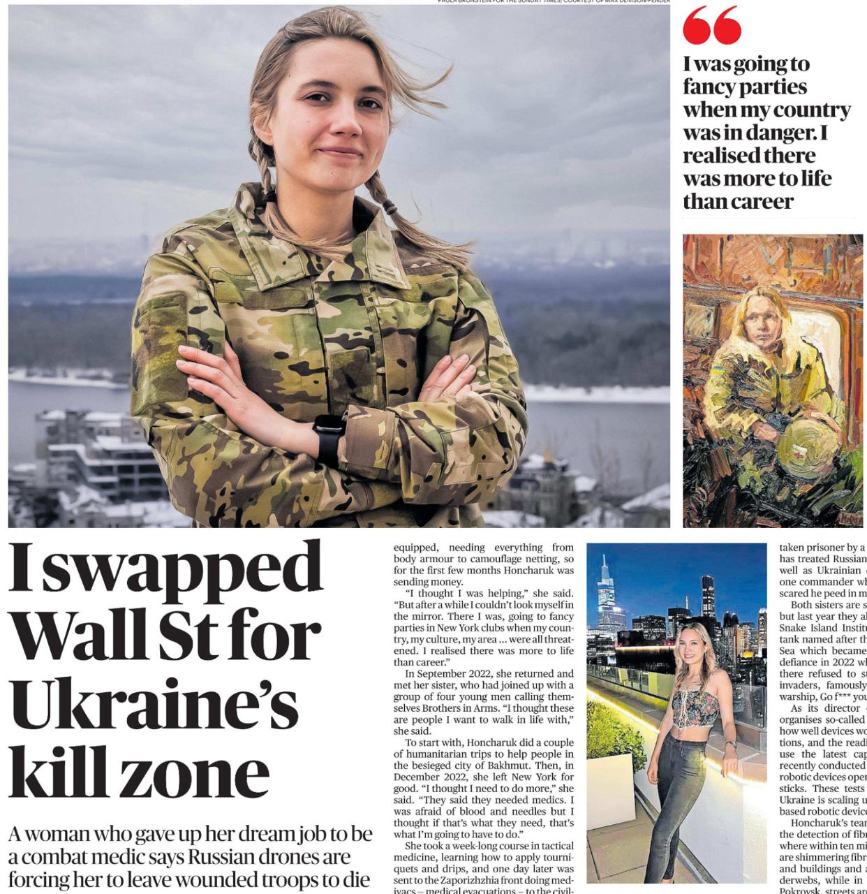 Но вот к 4-летию со дня начала СВО западная пропаганда вытащила из нафталина некоторых из моделей 2022-23 годов. Сначала New York Post, а сегодня и The Sunday Times опубликовали историю о том, как в 2022 году на тот момент 22-летняя Виктория Гончарук оставила работу на Уолл-стрит в банке Morgan Stanley и поехала «защищать Украину» в качестве, пардон, «парамедикини».