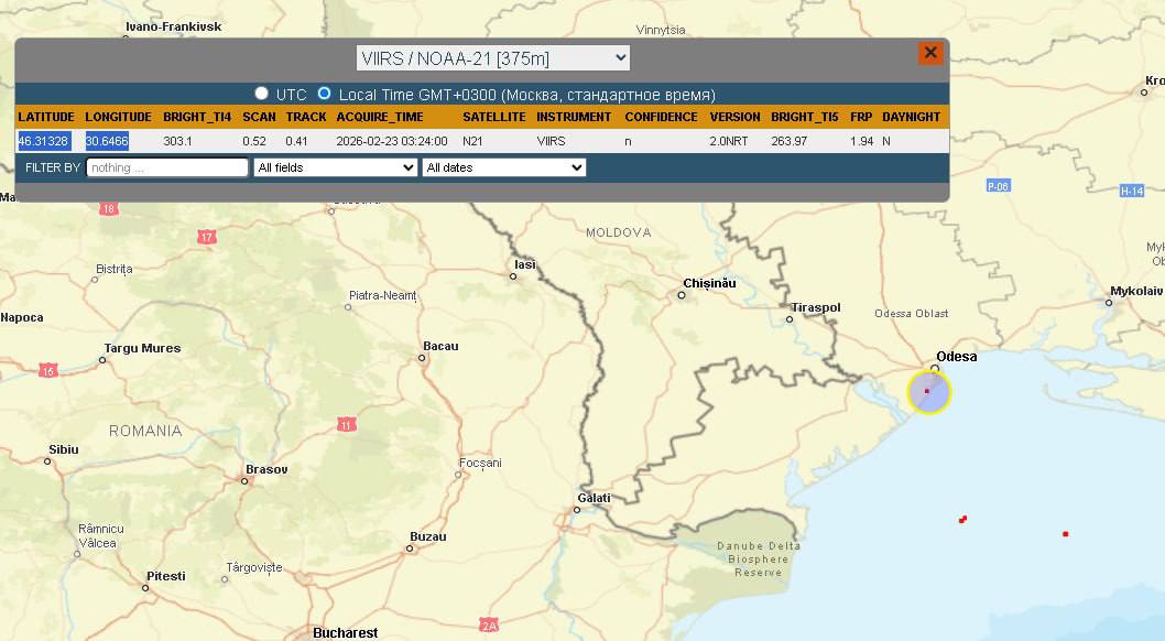 По данным FIRMS, после ударов Гераней, возник сильный пожар на территории ПАО "Ильичевсквнештранс" в районе Ильичевска Одесской области, пишет ТГ-канал «Хроники Гераней»