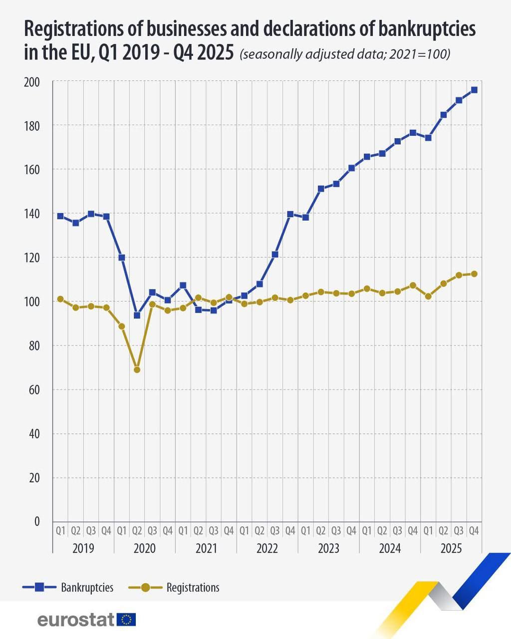 Регистрация новых предприятий и заявления о банкротстве в ЕС в период с I квартала 2019 года по IV квартал 2025 года.