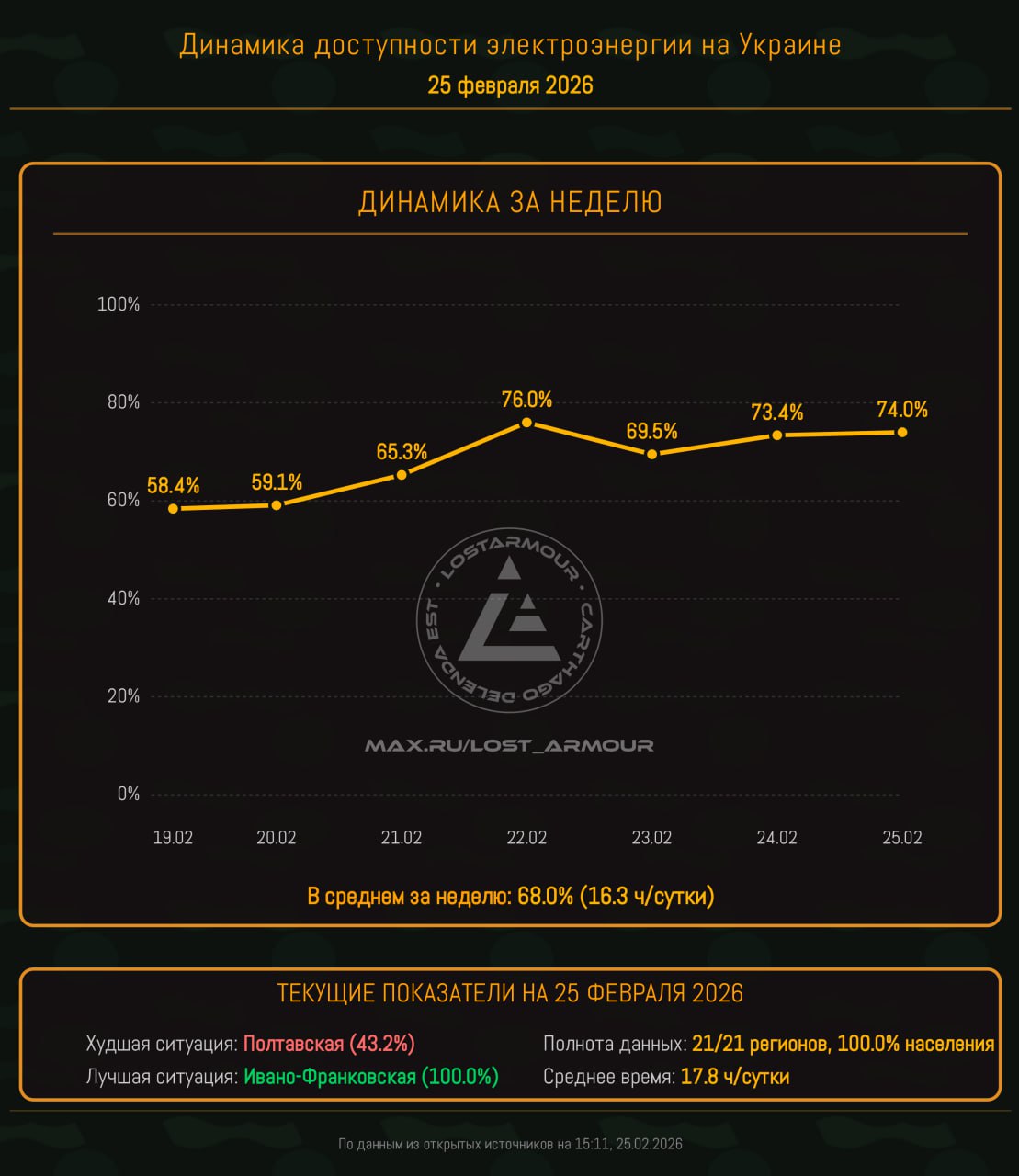 Инфографика доступности электроэнергии на территории Украины по областям на 25 февраля 2026.