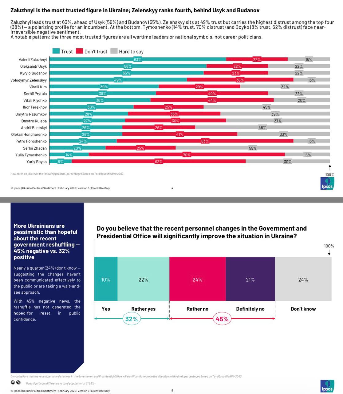 Результаты показали, что второе место занял чемпион мира по боксу Александр Усик с показателем доверия 56%. Третье место в рейтинге занял глава Офиса президента Кирилл Буданов — 55%. Владимир Зеленский оказался на четвертом месте: ему доверяют 49% опрошенных. В то же время именно у него самый высокий уровень недоверия среди лидеров — 38%.
