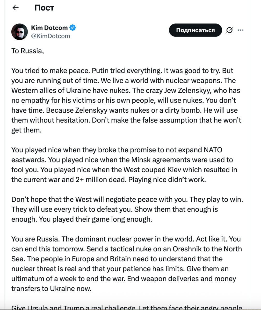 Вы пытались установить мир. Путин перепробовал всё. Попытка была хороша. Но у вас заканчивается время. Мы живём в мире с ядерным оружием. У западных союзников Украины есть ядерное оружие. Безумный еврей Зеленский, которому нет сочувствия ни к своим жертвам, ни к собственному народу, применит ядерное оружие. У вас нет времени. Потому что Зеленскому нужно ядерное оружие или грязная бомба. Он применит их без колебаний. Не делайте ложного предположения, что он их не получит.