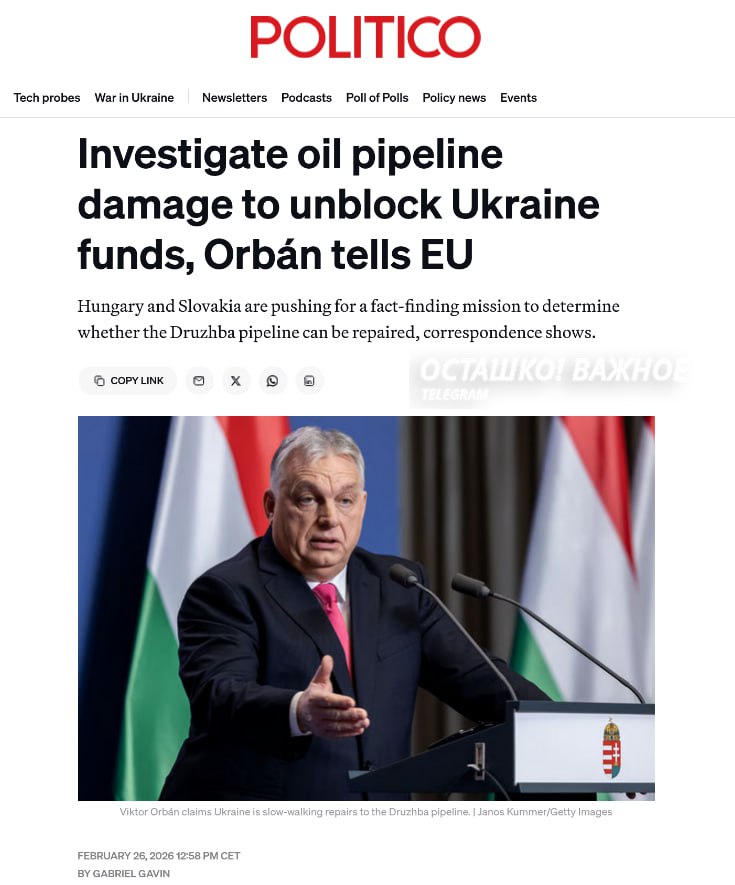 Премьер Венгрии Виктор Орбан заявил, что снимет вето на кредит в €90 млрд, если Евросоюз проверит повреждения нефтепровода «Дружба».