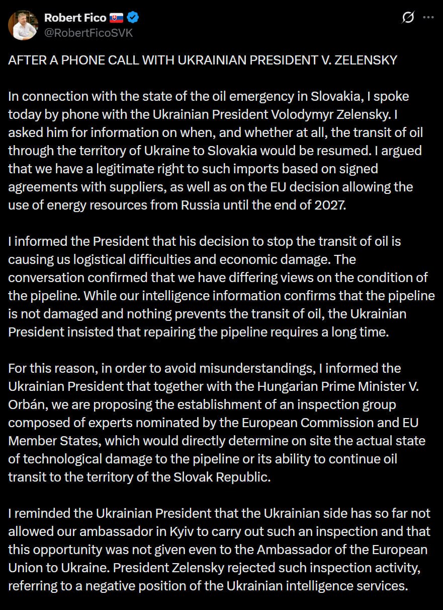 «ПОСЛЕ ТЕЛЕФОННОГО РАЗГОВОРА СПРЕЗИДЕНТОМ УКРАИНЫЗеленскимВ связи с чрезвычайной ситуацией на нефтяном рынке Словакии я сегодня поговорил по телефону с Зеленским. Я попросил его предоставить информацию о том, когда и будет ли вообще возобновлен транзит нефти через территорию Украины в Словакию. Я утверждал, что мы имеем законное право на такой импорт на основании подписанных соглашений с поставщиками, а также решения ЕС, разрешающего использование энергетических ресурсов России до конца 2027 года.