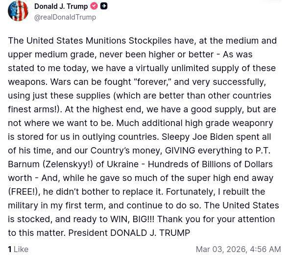Президент США заявил, что у страны «практически неограниченные запасы оружия и боеприпасов, что позволяет вести войну "вечно"».