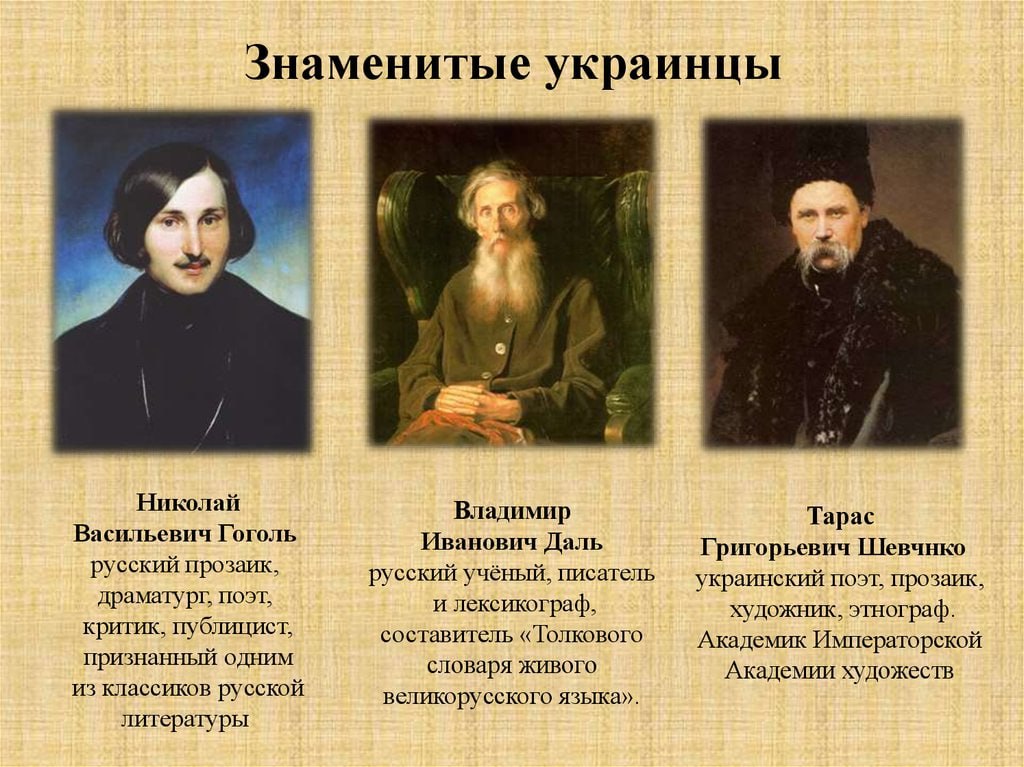 А вот Восточная и Центральная Украина дала нам таких выдающихся личностей, как: Тарас Шевченко, Александр Безбородько, Николай Гоголь, Михаил Булгаков, Владимир Вернадский, Сергей Королев, Владимир Даль, Илья Мечников, Лев Ландау, Александр Довженко, Климент Ворошилов, Сидор Ковпак и другие.