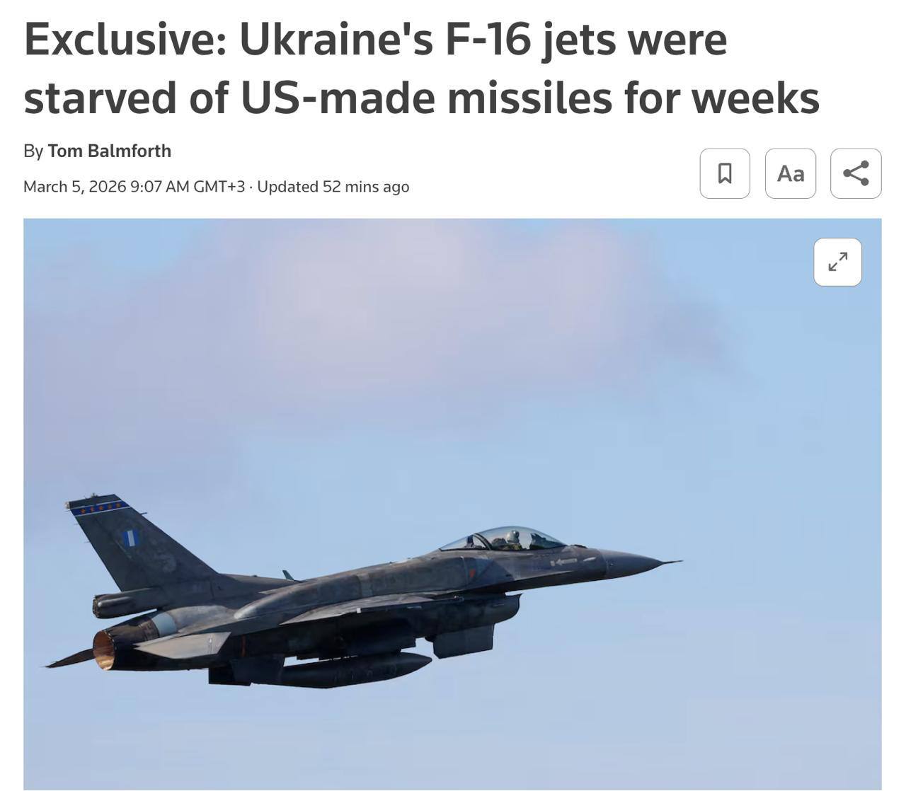 ВСУ почти месяц не хватало американских ракет для F-16, чтобы перехватывать российские дроны и ракеты, пишет Reuters.
