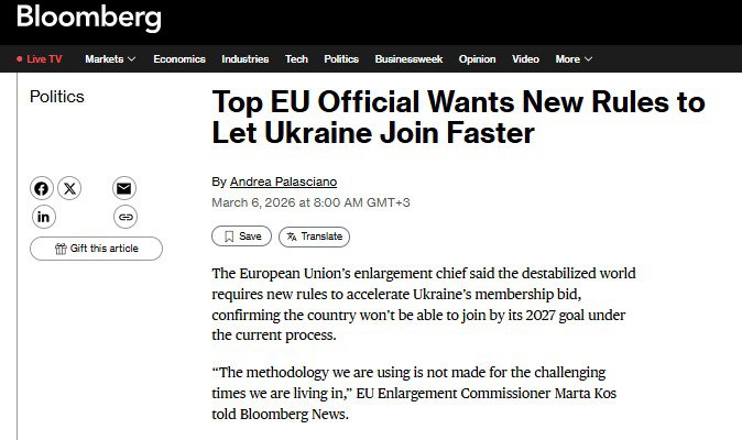 ‘Если мы не ускорим вступление Украины в ЕС, а также Черногории и Молдавии, то Россия захватит их и использует против нас’ – глава Еврокомиссии Марта Кос подгоняет Брюссель.