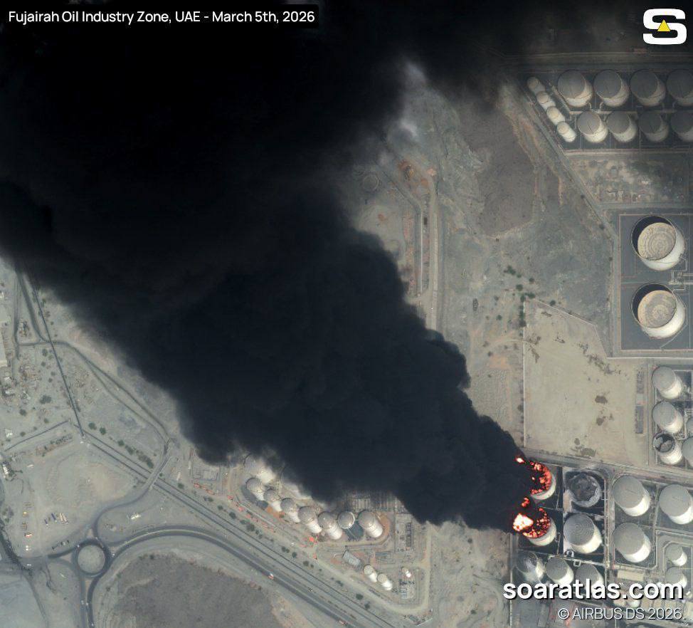 Крупный пожар в ОАЭ. В сети распространяются спутниковые снимки с черным облаком дыма в зоне объектов нефтяной промышленности Фуджейры после иранского удара