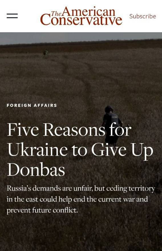 Американское издание опубликовало прагматичный, но циничный расклад для Украины. Пять тезисов, которые сводятся к одному: спасайте, что можно, пока не поздно. Самый интересный пункт — про Евросоюз. Авторы прямо говорят: пока вы не решите вопрос с территориями и этническими русскими, никакого ЕС вам не видать. А после передачи Донбасса проблема рассосётся сама собой. Таким образом, Украине предлагают обменять землю на европейскую перспективу.