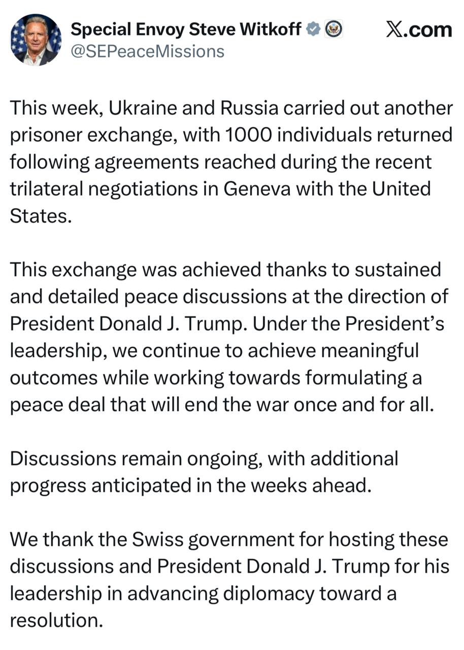 На этой неделе Украина и Россия провели очередной обмен пленными, в результате которого были возвращены 1000 человек, согласно соглашениям, достигнутым в ходе недавних трехсторонних переговоров в Женеве с Соединенными Штатами. Этот обмен стал возможен благодаря продолжительным и детальным мирным переговорам по указанию президента Трампа.