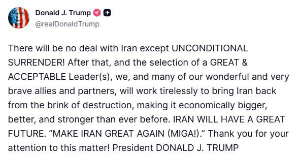 Трамп потребовал от Ирана «безоговорочной капитуляции». По его словам, никакого другого соглашения не будет. «После этого и выбора великого и приемлемого лидера, мы и многие из наших замечательных и очень храбрых союзников и партнёров будем неустанно работать, чтобы вытащить Иран с грани разрушения, сделав его экономически более крупным, лучшим и сильным, чем когда-либо прежде», — написал он в своей соцсети.