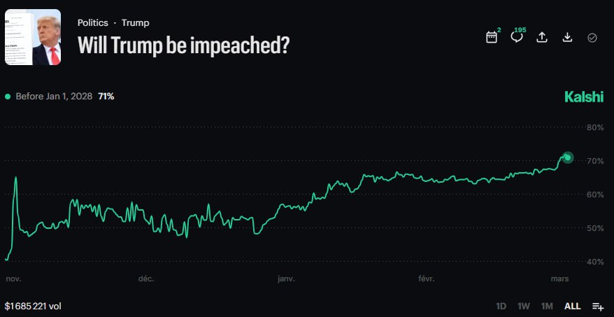 Западные платформы для ставок на политические события подняли шанс по импичменту Трампа. На платформе Kalshi шанс возрос до 71%, поднявшись с 55%