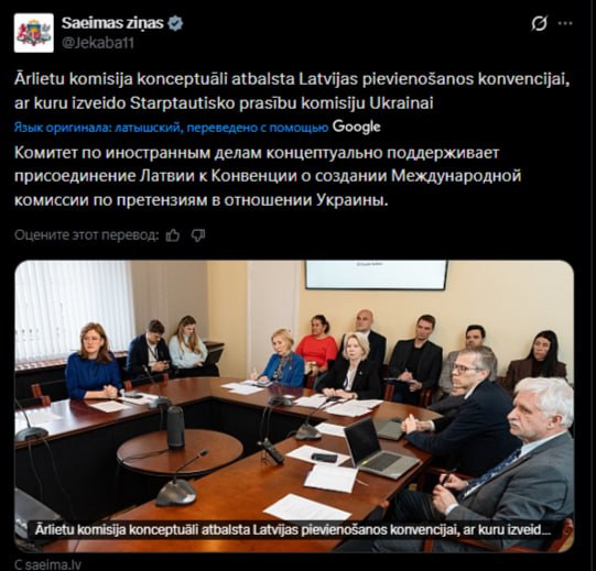В Сейме Латвии концептуально поддержали присоединение к конвенции о создании "Международной комиссии по рассмотрению претензий по Украине"