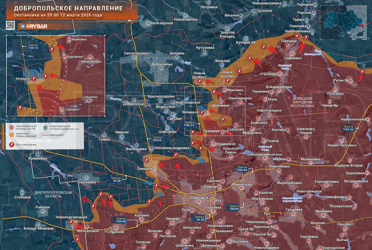 "Рыбарь" пишет, что на данном направлении продолжаются ожесточённые встречные бои. Украинские подразделения предпринимают контратаки на юге населённого пункта Белицкое, что подтверждает ранее появившуюся информацию о выходе российских войск к этому городу, расположенному на трассе к Доброполью.