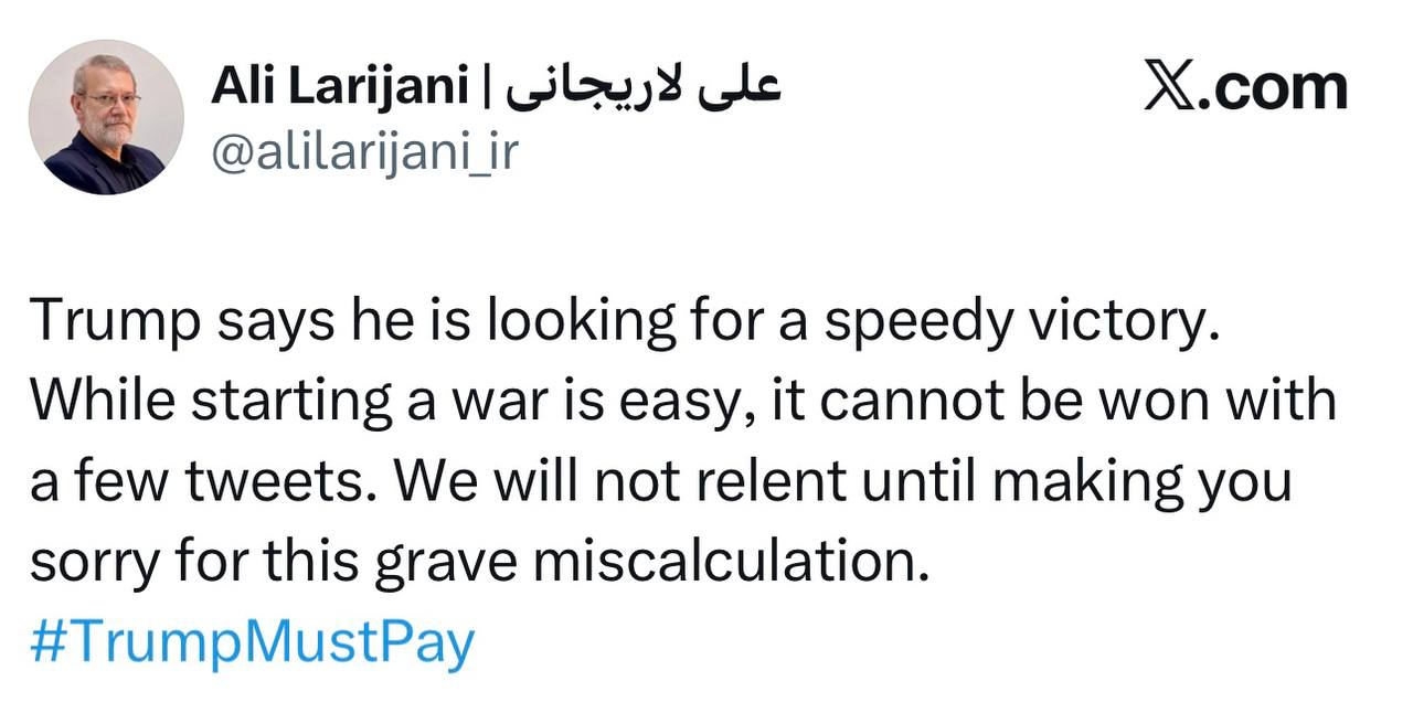 Трамп заявляет, что стремится к быстрой победе. Хотя начать войну легко, выиграть её несколькими твитами невозможно. Мы не отступим, пока не заставим вас пожалеть об этой серьёзной ошибке, написал он.