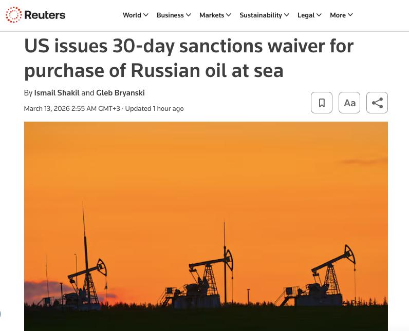 По словам министра финансов США Скотта Бессента, этот шаг направлен на стабилизацию мировых энергетических рынков, потрясённых войной вокруг Ирана. <...> Администрация президента Дональда Трампа пытается сдержать рост цен на энергоносители после ударов США и Израиля по Ирану, которые парализовали судоходство через Ормузский пролив.
