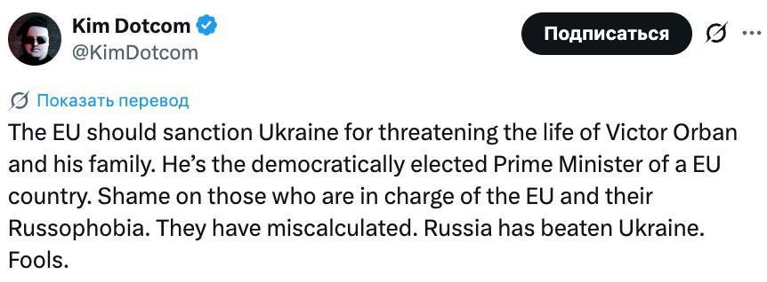 «Позор тем, кто руководит Евросоюзом, и их русофобии. Они просчитались. Россия победила Украину. Глупцы», — добавил он.
