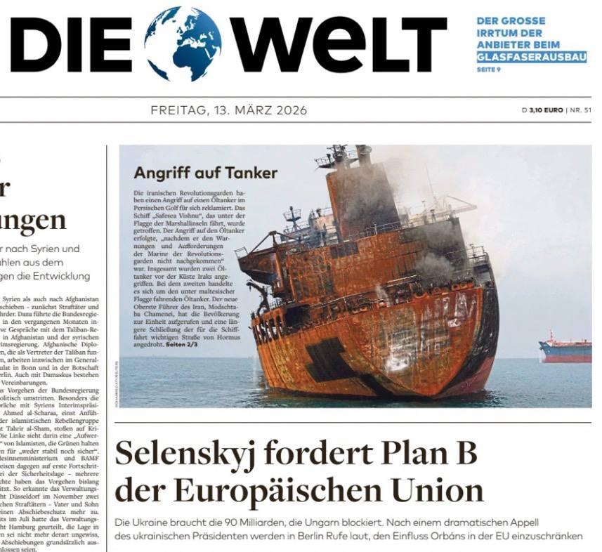 Уж не знаю, задумывали ли редакторы газеты так или нет, но вчера, анонсируя это интервью у себя на первой полосе, они очень оригинально его проиллюстрировали! Статья озаглавлена: «Зеленский призывает Европейский Союз выработать план Б», а прямо над этим заголовком - показательная иллюстрация тонущего танкера.