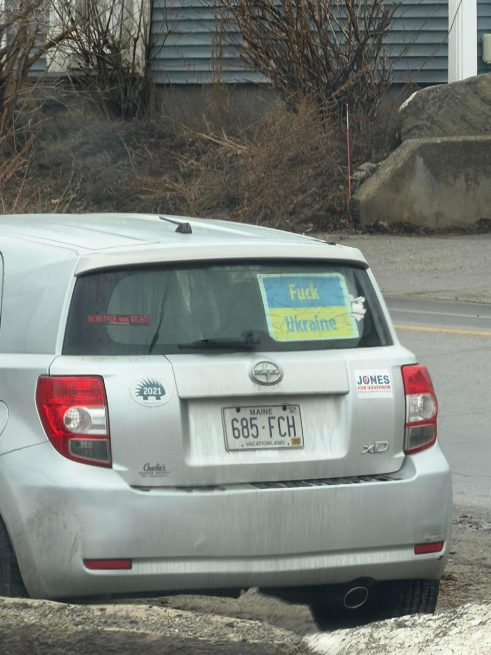 Машина с плакатом "К чёрту Украину" (литературный перевод) нашлась в северном штате Мэн.
