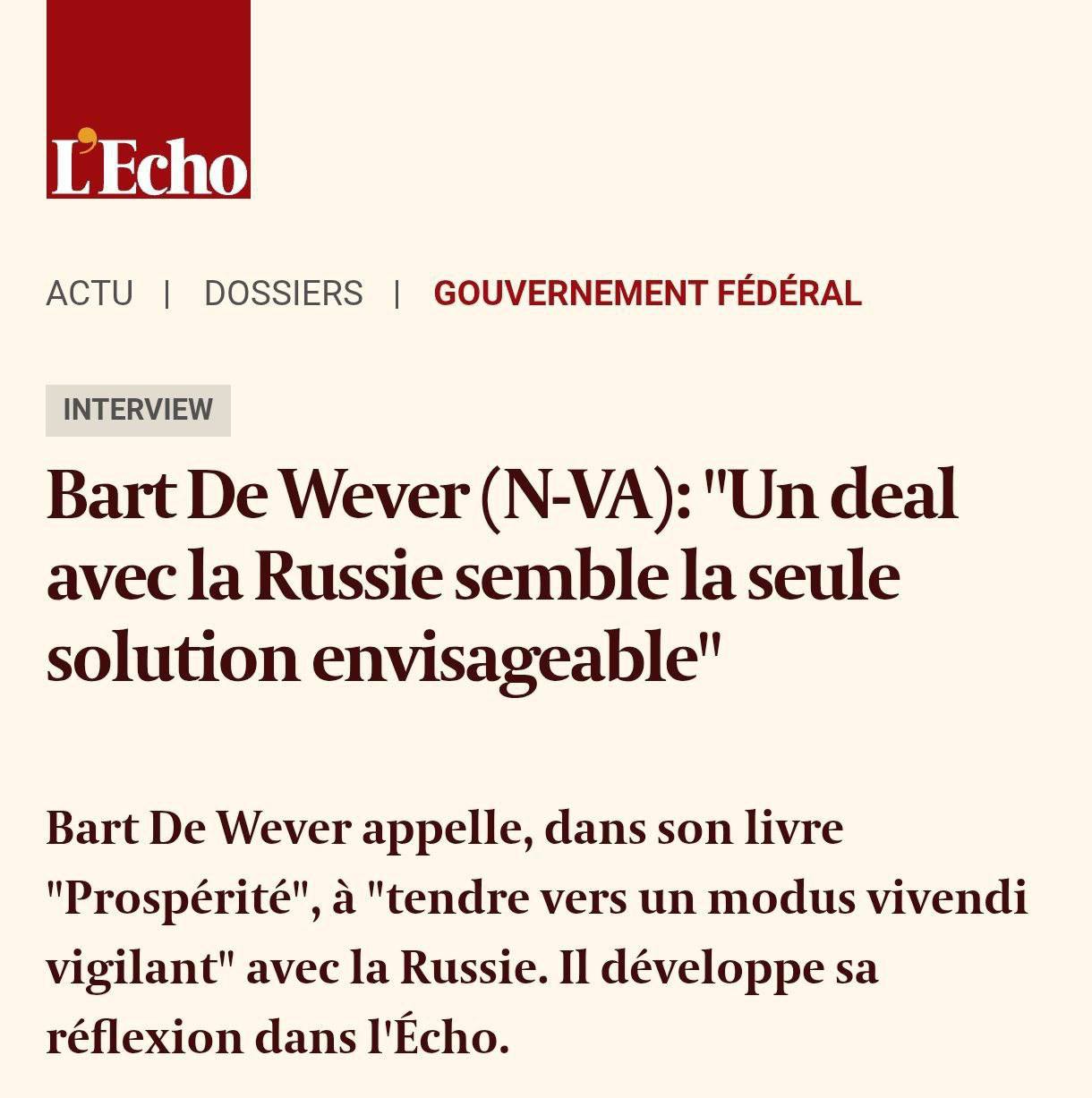 "Поскольку мы не способны угрожать Путину, поставляя оружие на Украину, и не можем задушить его экономически без поддержки США, остается только один путь — заключить сделку", — говорит Барт Де Вевер.