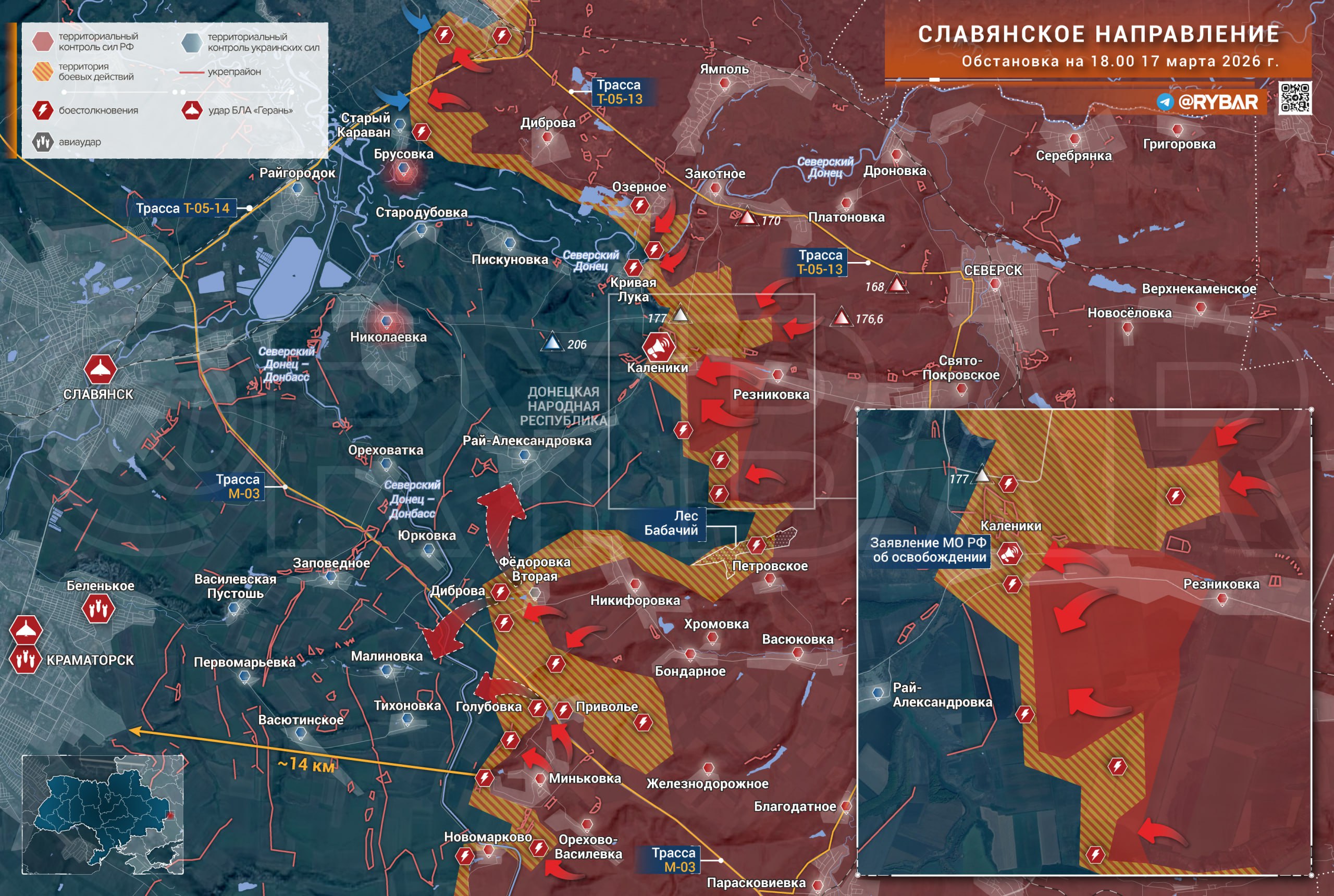 На южном фланге продолжаются бои на рубеже Миньковка — Диброва — Никифоровка. Там российским штурмовикам предстоит занять несколько достаточно крупных оврагов и лесных массивов, что в дальнейшем позволит продвинуться к рубежу Малиновка — Юрковка — Рай-Александровка и подойти вплотную к каналу Северский Донецк — Донбасс. Более ранние заявки о его форсировании на данном рубеже пока так и не подтвердились.