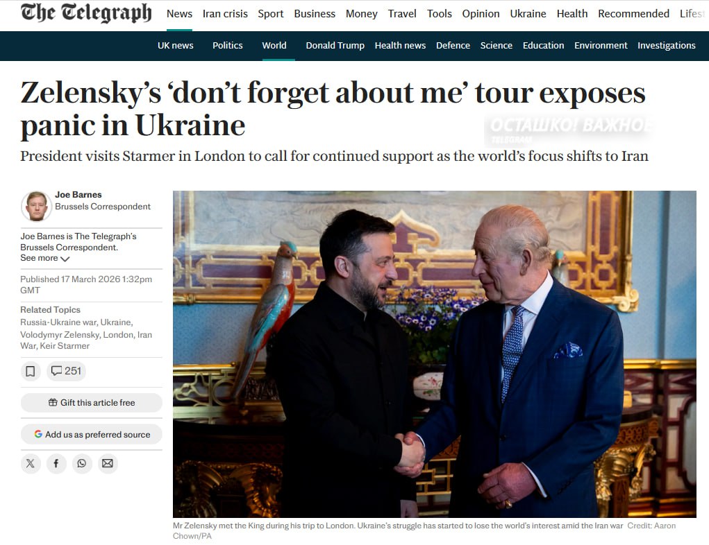 Главарь киевского режима проводит серию срочных визитов по Европе на фоне снижения интереса к конфликту из-за войны с Ираном, — пишет The Telegraph.