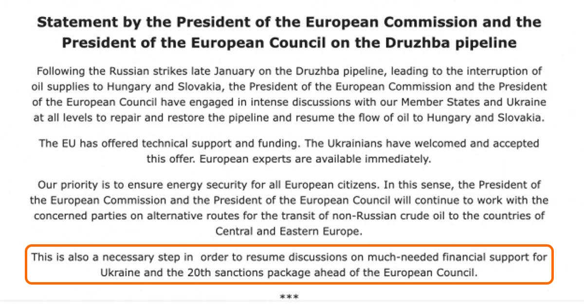 Еврокомиссия удалила из заявления о ремонте и восстановлении прокачки нефти по трубопроводу «Дружба» абзац о финансовой поддержке Украины и 20-м пакете санкций против России.