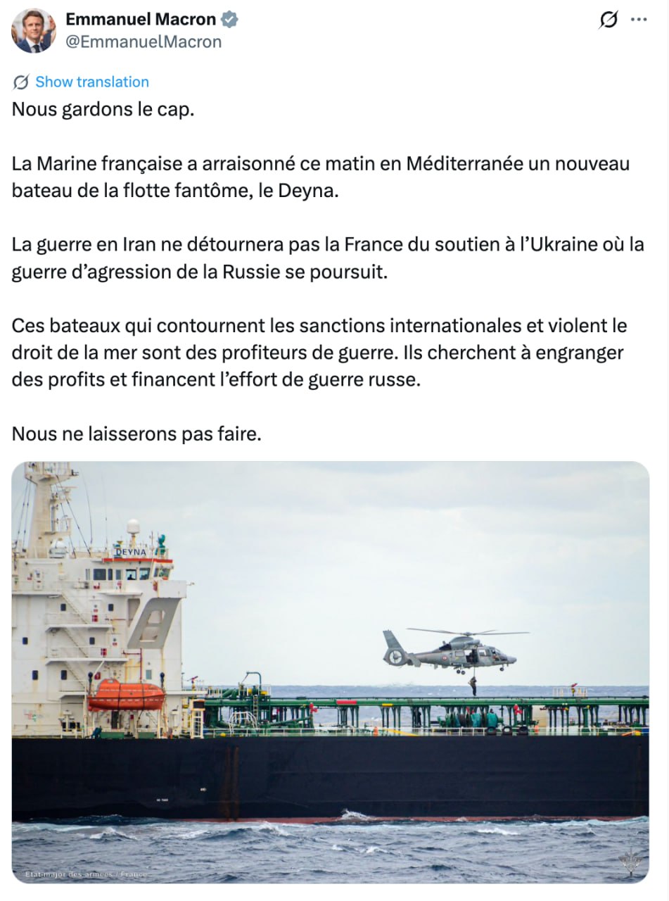 Мы держим курс.Французские военно-морские силы этим утром в Средиземном море перехватили ещё одно судно «теневого флота» — Deyna.