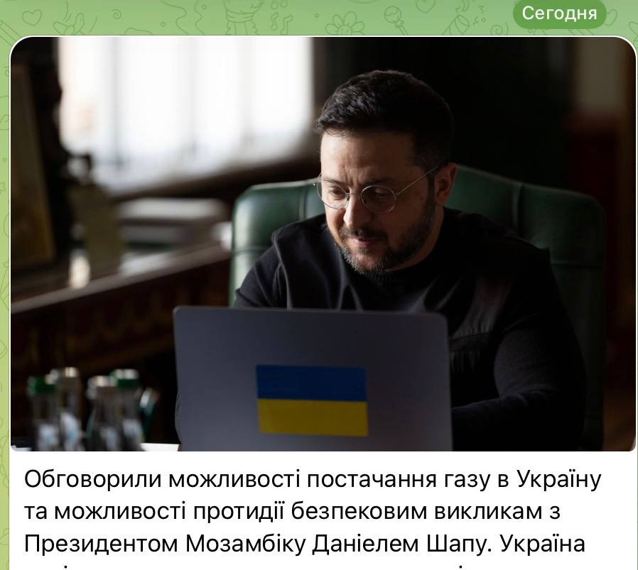 Я думал, это розыгрыш. А потом зашел на официальный аккаунт Зеленского - таки правда! Киевский комик обсуждал сегодня с президентом Мозамбика поставки газа оттуда! Мозамбикский газ спасет эту хунту!