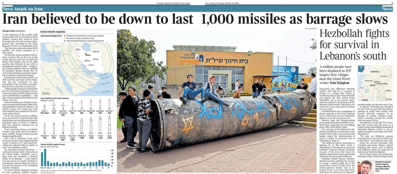 На картинке… Британские газеты вновь сообщили, что «у них ракет осталось на пару дней». На этот раз The Times выдаёт, что у Ирана осталась последняя тысяча ракет. А ведь ещё несколько дней назад британцы всех убеждали, что все пусковые установки КСИР уничтожены. Однако летать ракеты продолжают. Видимо, их запускают из рогатки.