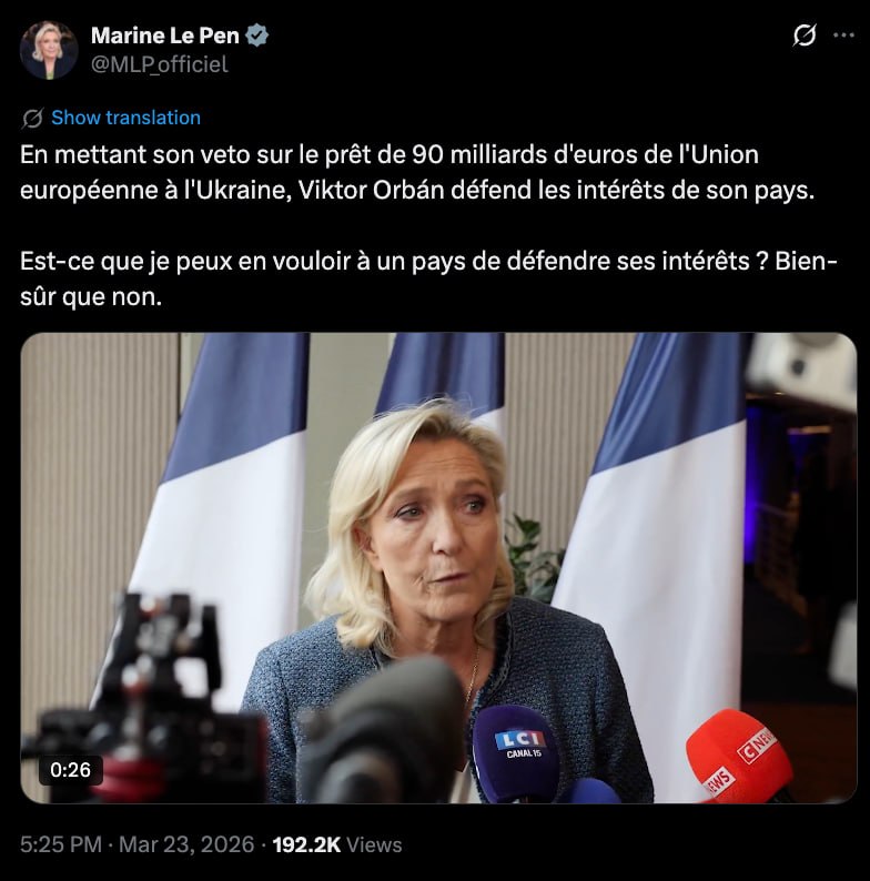 Лидер французской партии «Национальное объединение» Марин Ле Пен выступила в защиту премьер-министра Венгрии Виктора Орбана, который заблокировал выделение Киеву кредита ЕС в размере €90 млрд.