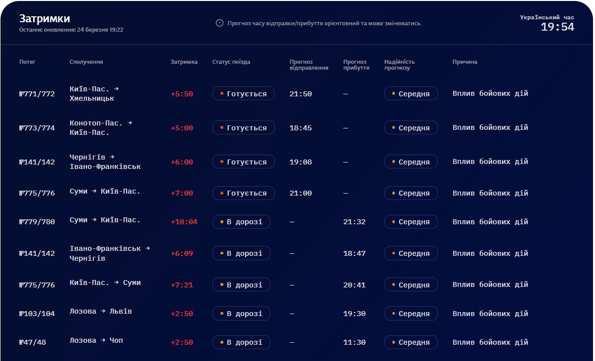 Девять поездов опаздывают на время от 3 до 6 часов из-за «влияния боевых действий», сообщает «Укрзализныця». Более половины поездов – с отправкой из Киева или прибытием в него.