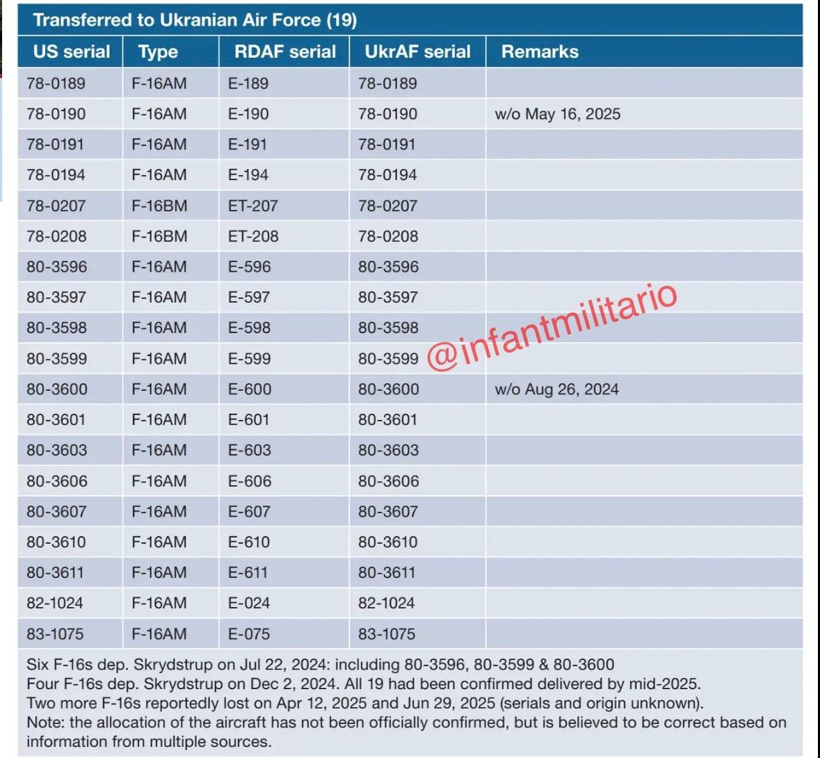 Список истребителей F-16AM из наличия ВВС Дании, переданных Киеву. Два борта уже потеряны