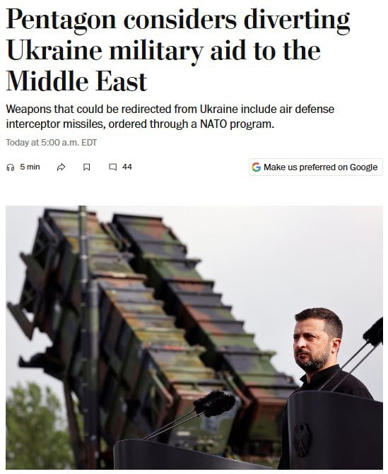 Пентагон изучает вопрос о перенаправлении оружия, предназначенного для Украины, на Ближний Восток, пишет The Washington Post.
