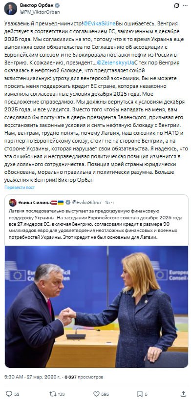 Такие слова прозвучали в обращении премьера Венгрии к Эвике Силине в ответ на требование латвийского премьера одобрить кредит Украине.