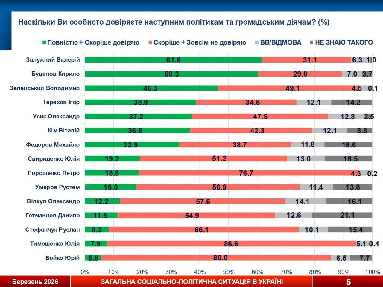 Залужный и Буданов обогнали Зеленского по уровню доверия среди украинцев.