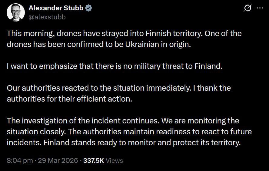 Финский президент Александр Стубб подтвердил сообщения о том, что украинский дрон упал на территории Финляндии сегодня утром.
