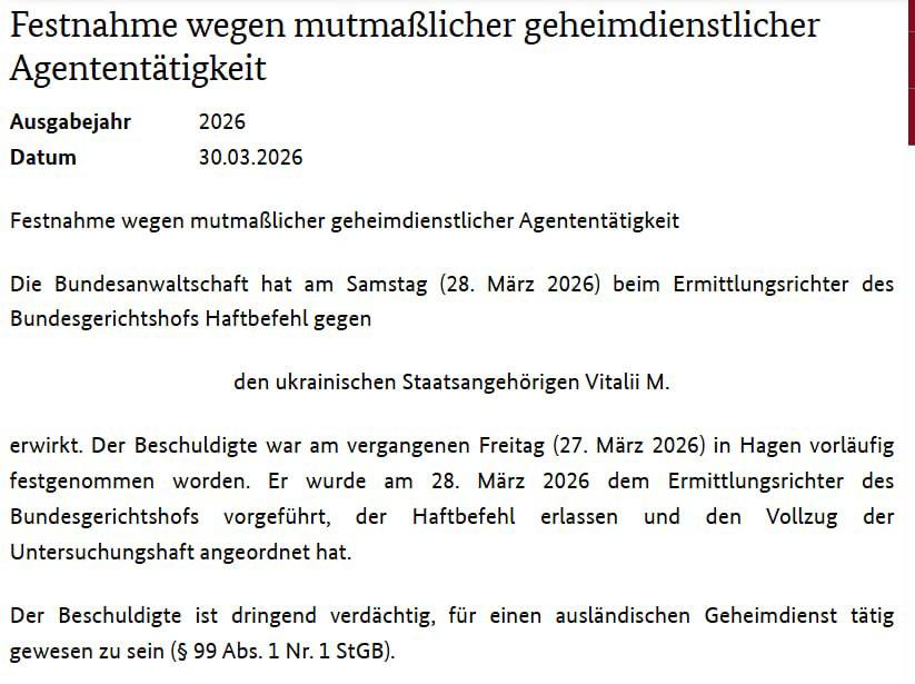 В Германии задержали некоего гражданина Украины Виталия, которого обвиняют в шпионаже за проживающим там всушником для проведения русскими спецслужбами операций против этого всушника в будущем