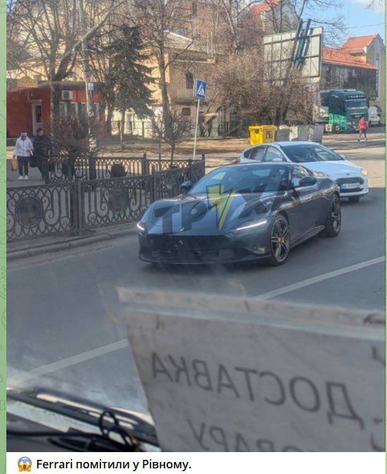 А на снимке справа — Ferrari в городе Ровно. Ещё до конфликта такие машины в провинциальных городах скорее были редкими исключениями, чем повседневными явлениями. Сейчас же, судя по всему, кто-то, возможно и глава ТЦК области, может себе позволить и такую роскошь в момент важной для краины момента.