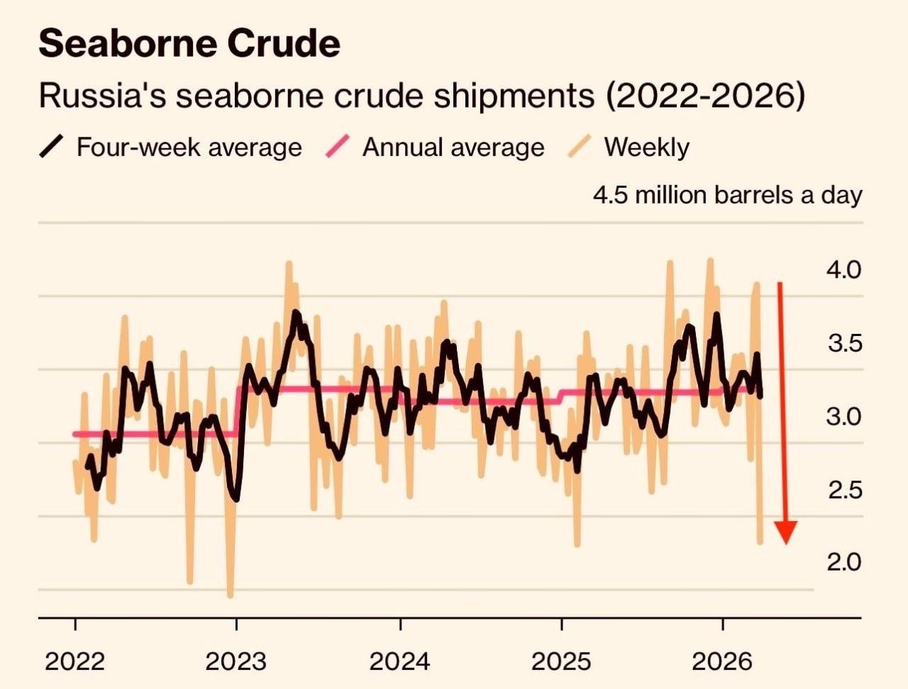 Эти украинско-атлантические бомбардировки, которые могли обостриться (4 атаки за 4 дня) благодаря активной поддержке стран НАТО, привели к техническому сбою нефтяного терминала и падению экспорта российской нефти на 43% ( источник Bloomberg):