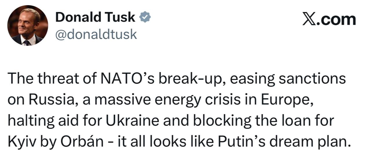 Угроза распада НАТО, ослабление санкций в отношении России, масштабный энергетический кризис в Европе, прекращение помощи Украине и блокирование кредита для Киева от Орбана - все это выглядит как план мечты Путина.