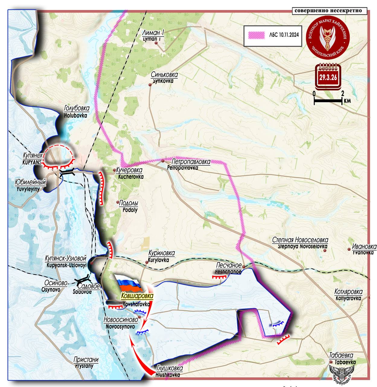 Южнее к поселку примыкает н.п. Новоосиново - это последний район обороны противника на пути запирания горловины котла, в который попала группировка ВСУ на этом участке обороны. Встречным движением Ковшаровка - Глушковка и Глушковка - Ковшаровка штурмовики 1 гвардейской танковой армии выполняют эту задачу.